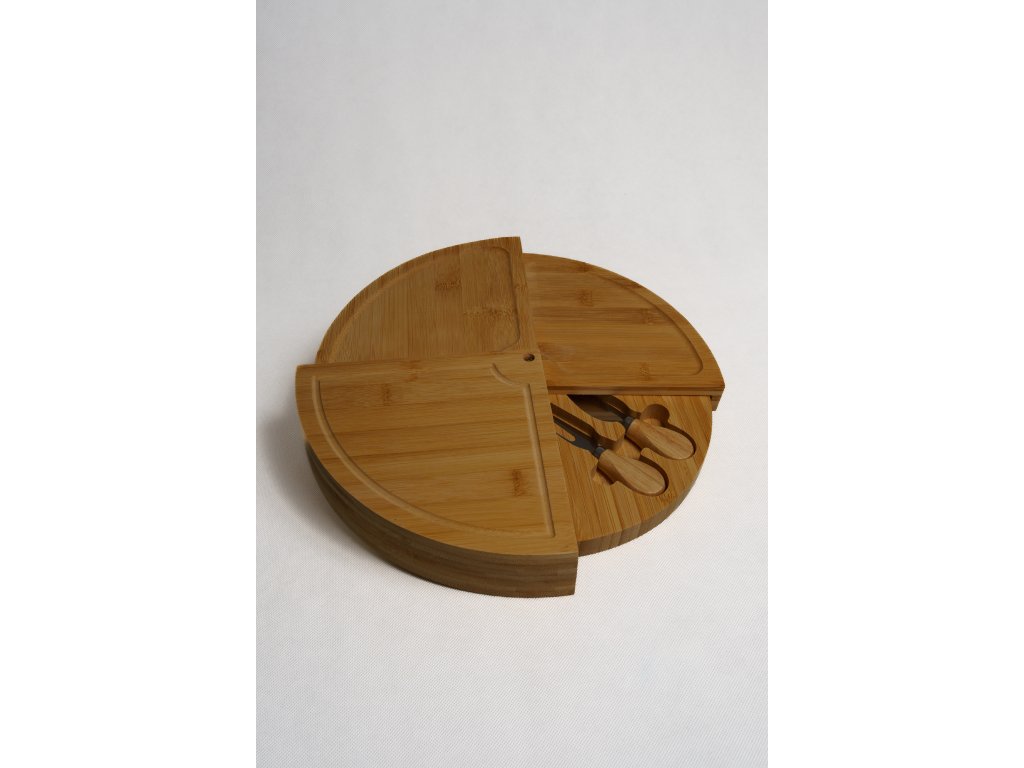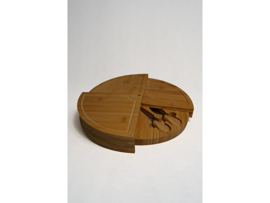 Vo vnútri sa nachádza skrytý úložný priestor so sadou syrových nožov a servírovacích nástrojov, takže máte všetko potrebné vždy po ruke. Stačí set položiť na stôl, rozložiť jednotlivé časti a hostia majú k dispozícii nielen dobroty, ale aj vhodné náčinie na ich krájanie a naberanie. Bambusové drevo je pevné a odolné, no zároveň pôsobí ľahko a moderne, vďaka čomu sa hodí do väčšiny kuchýň a jedální.
