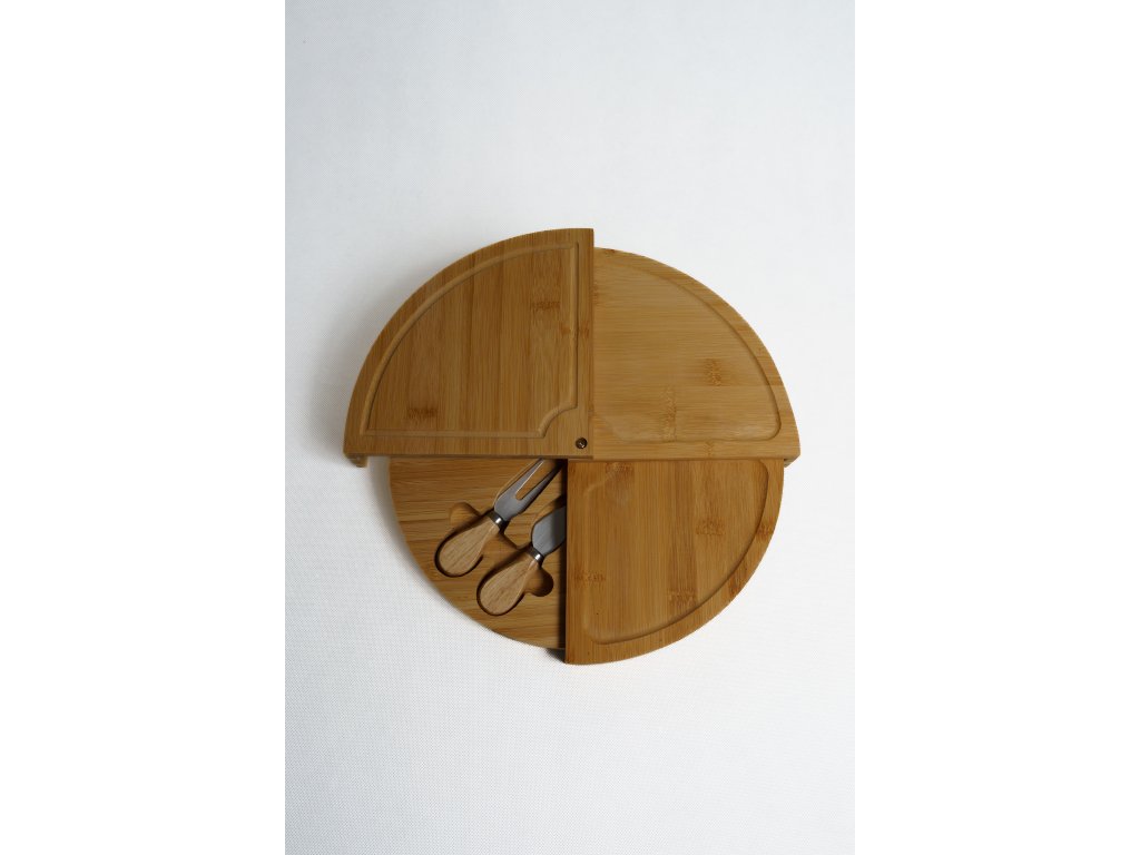 Vo vnútri je skrytý priestor so sadou syrových nožov a servírovacích nástrojov, takže máte všetko potrebné vždy po ruke – stačí set položiť na stôl, rozložiť jednotlivé časti a hostia majú k dispozícii nielen dobroty, ale aj vhodné náčinie na ich krájanie a naberanie. Bambusové drevo je pevné a odolné, zároveň pôsobí ľahko a moderne, takže sa set hodí do väčšiny kuchýň a jedální.