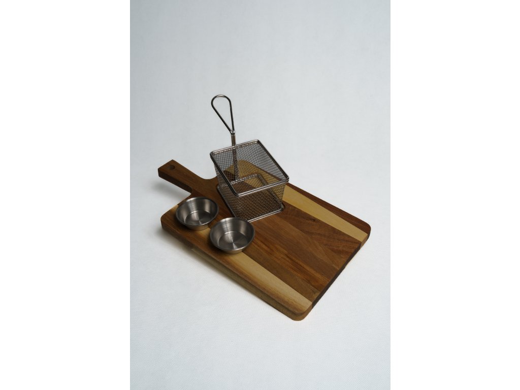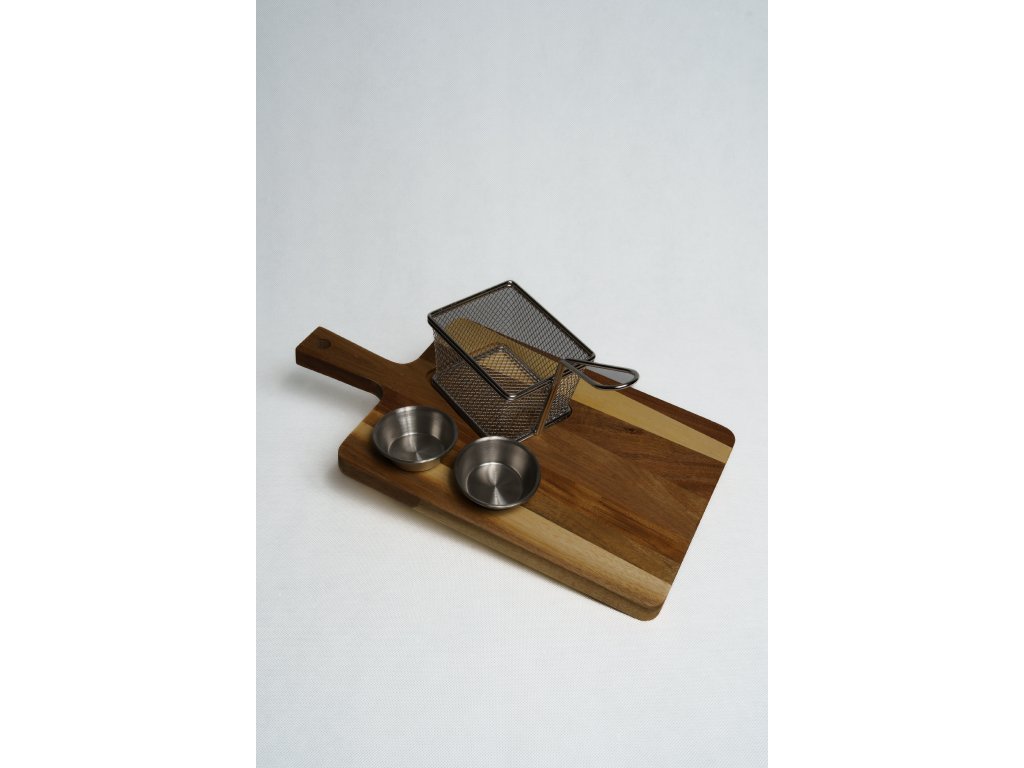 Táto drevená servírovacia doska s rozmermi 40 × 22 cm je navrhnutá tak, aby spríjemnila každé stolovanie – od bežných rodinných večerí až po posedenie s priateľmi pri víne. Doska ponúka dostatok priestoru na servírovanie syrov, údenín, ovocia, pečiva či menších pochutín, pričom kovové misky a stojan umožňujú podávať dipy, omáčky, oriešky alebo ďalšie dobroty prehľadne a elegantne.