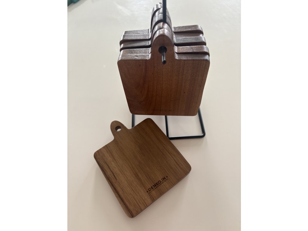 Sada 6 ks drevených dosiek na krájanie so železným stojanom.